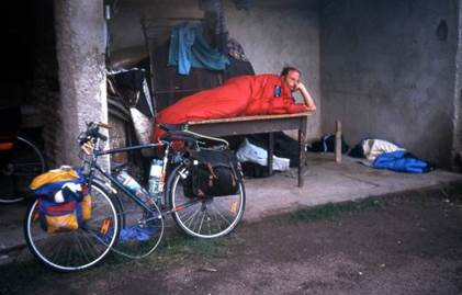 Am Abend erreichen wir am Ende der Piste ein Dorf. Biwak unter dem Vordach einer Schule.