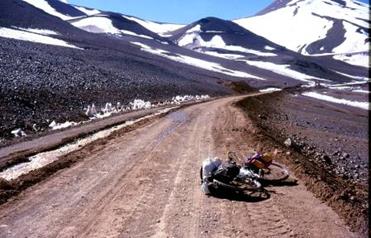 Geschafft!. Um ca 20 Uhr, nach 12 Stunden Reise sind wir oben auf der Passhöhe des Agua Negra, auf 4800m. Im Westen leuchtet noch das aller- letzte Sonnenlicht, es ist eiskalt, die Wasserpfützen sind gefroren. Zum Biwakieren müssen wir schnellstens hinab |